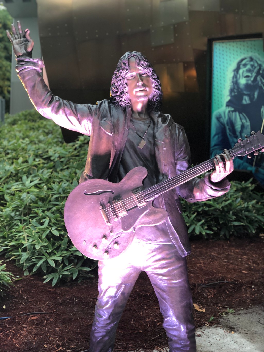 The late rocker was honored with a bronze statue outside the museum, commissioned by his wife, Vicky Cornell, and designed by Nick Marra. The sculpture features Cornell with a guitar in one hand and a pick in the other, donning his signature boots, a dog tag, and loose curls.